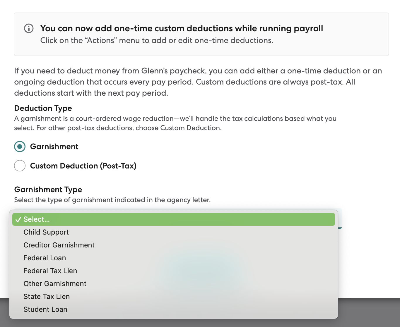 Scroll down to the bottom of the employee's profile and click 'Add Garnishment or Custom Deduction'